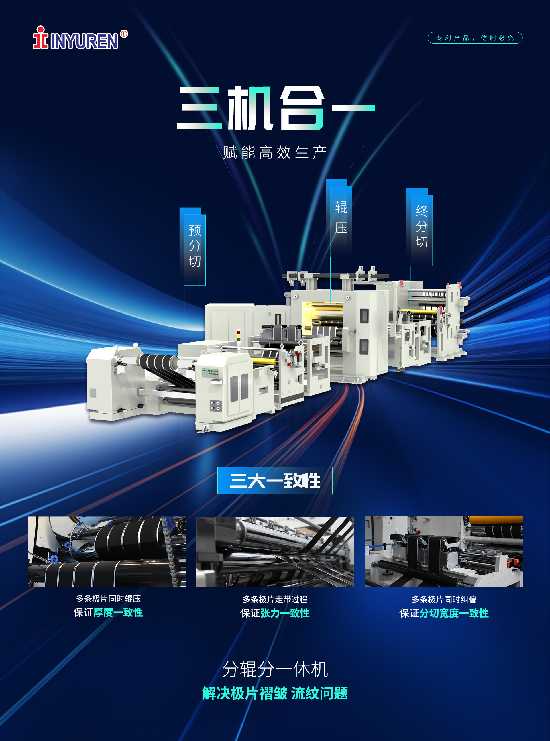 古天乐太阳集团城分辊分一体机,主要应用于多条幅(斑马涂)极片的辊压分切工序,创新性地将预分切、辊压、终分切这3个工序融合为一个设备,不仅契合了工序融合一体化需求,赋能高效生产,还保证了厚度一致性、张力一致性、分切宽度一致性,完美解决了因张力、压力、应力等不均匀导致的褶皱、流纹问题,助力极片高质量智造。一体化的设计,优化了生产流程,极大地提高了生产效率,大幅降低采购成本,并有效地减少了对厂房面积的需求。