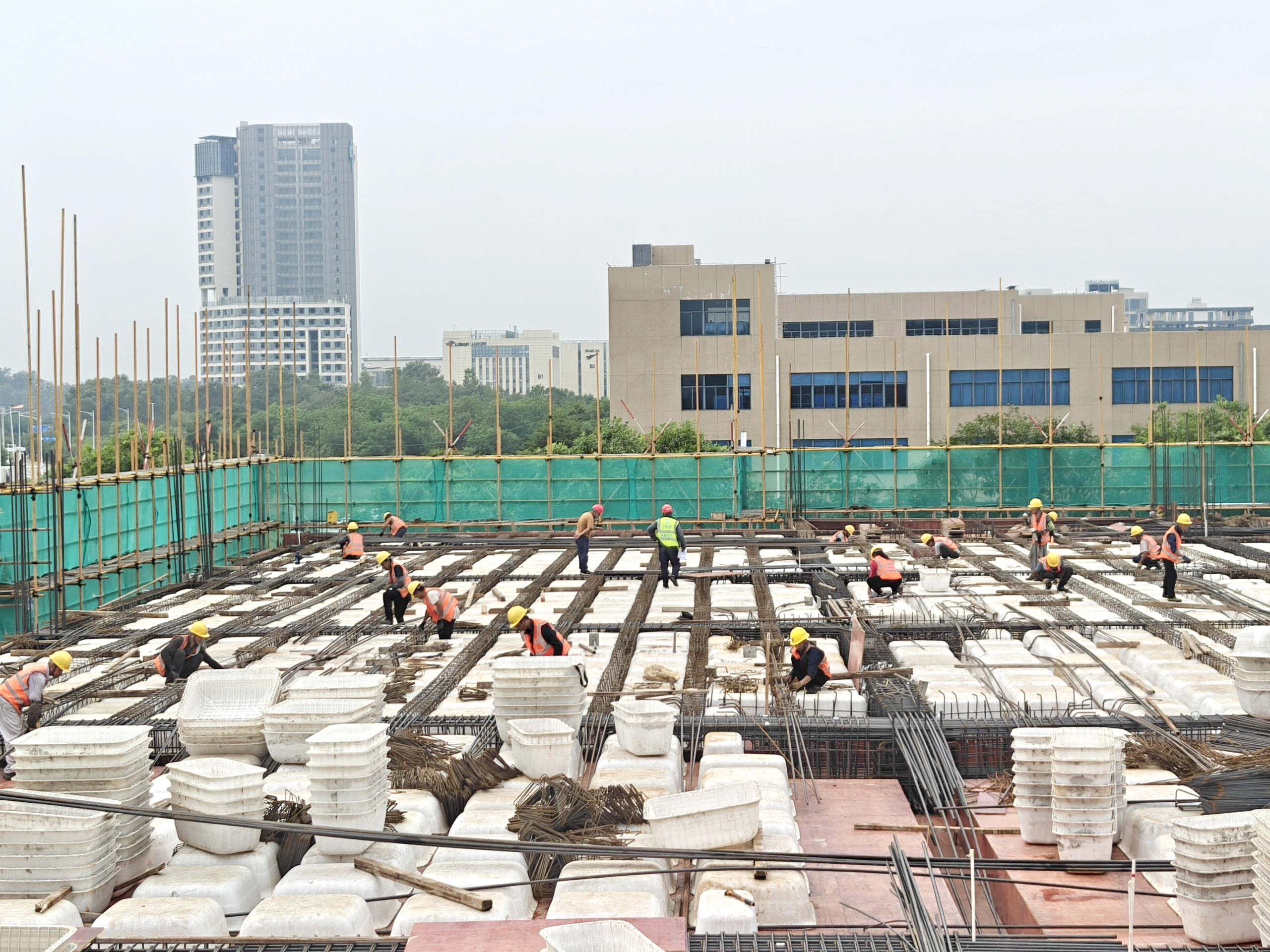 目前,园区建设项目已推进至二层板面施工阶段,正在进行密肋板模安装与梁板钢筋绑扎,计划于2025年10月31日进行二层板面首区混凝土浇筑;宿舍楼已完成首层承台、地梁及级配碎石回填等施工。
