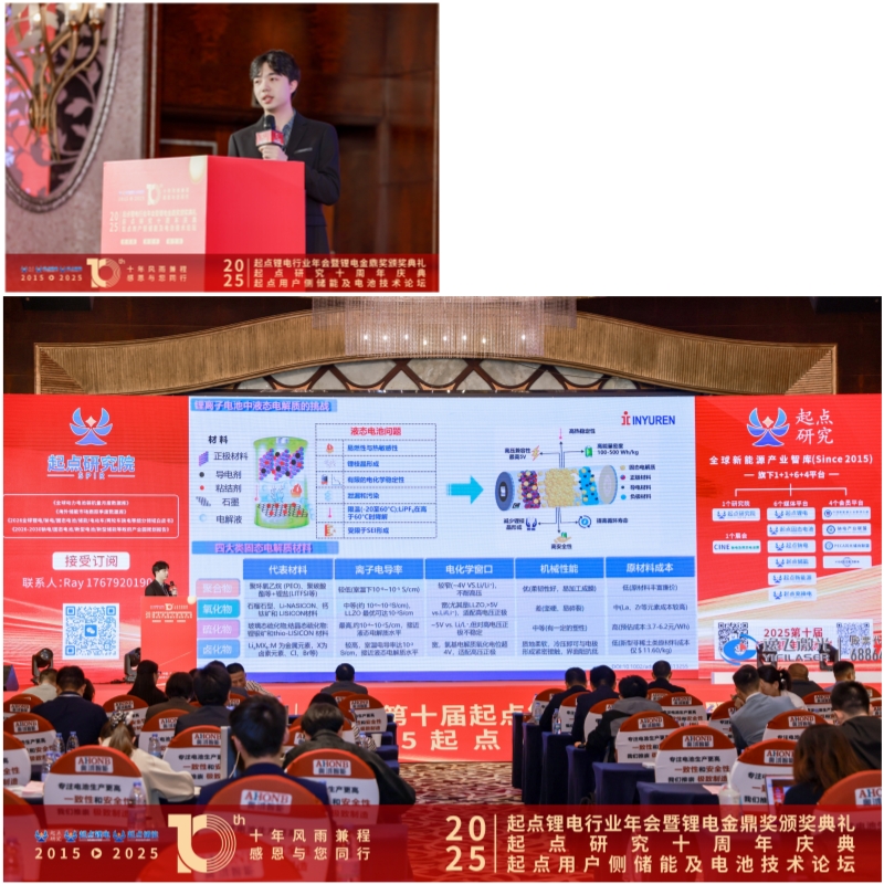 2025年12月18-19日,以“新周期、新技术、新生态”为主题的“2025(第十届)起点锂电行业年会暨锂电金鼎奖颁奖典礼&起点研究十周年庆典、2025起点用户侧储能及电池技术论坛”在深圳举行,古天乐太阳集团城与会代表——古天乐太阳集团城应用技术研究院谢尚辰做了《卤化物固态电解质的技术进展》主题演讲和参与圆桌对话。同期,古天乐太阳集团城收获了由大会颁发的“2025年度锂电行业客户信赖品牌”奖项。