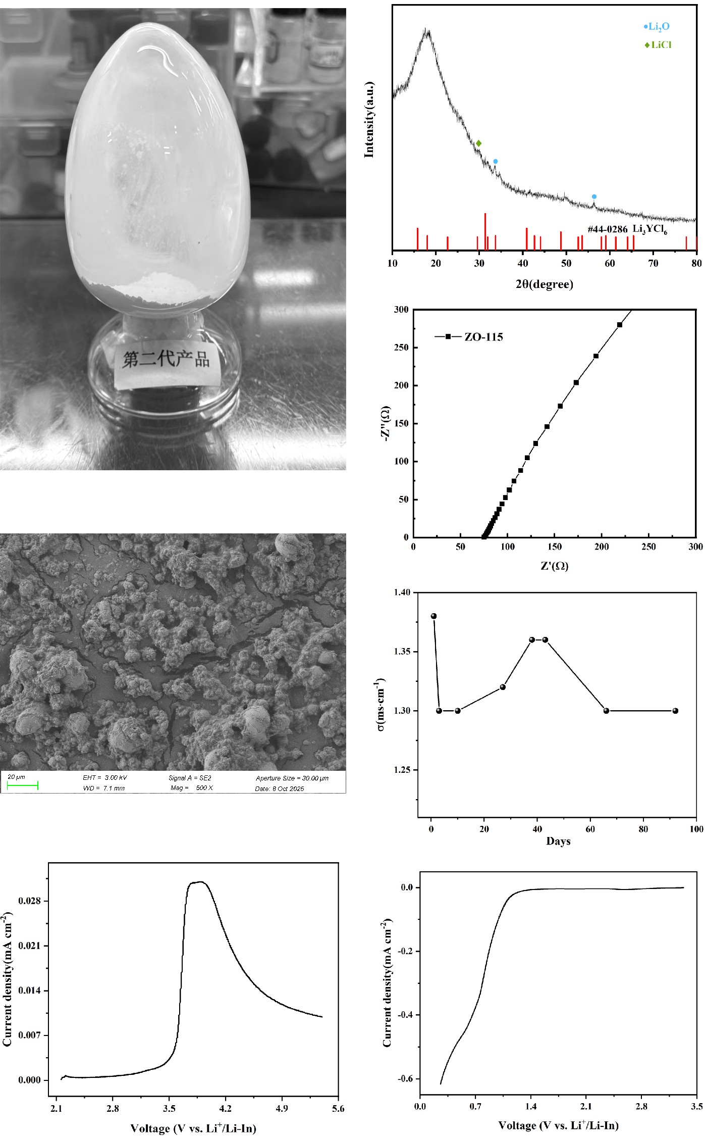 2、古天乐太阳集团城第二代卤氧化物电解质材料,在材料体系中引入氧元素实现晶体结构调控,离子电导率达到1.4 mS/cm,电子电导率<10-9 S/cm,粒径<5 μm,锂离子迁移能垒显著降低,库伦效率提升至86%,电池容量和循环性能更好,为电解质带来了更宽的电化学稳定窗口(2-6 V),具备推动电池能量密度跃升的潜力。目前第二代体系的实验室样品已完成关键电化学表征,进入电池级测试阶段。