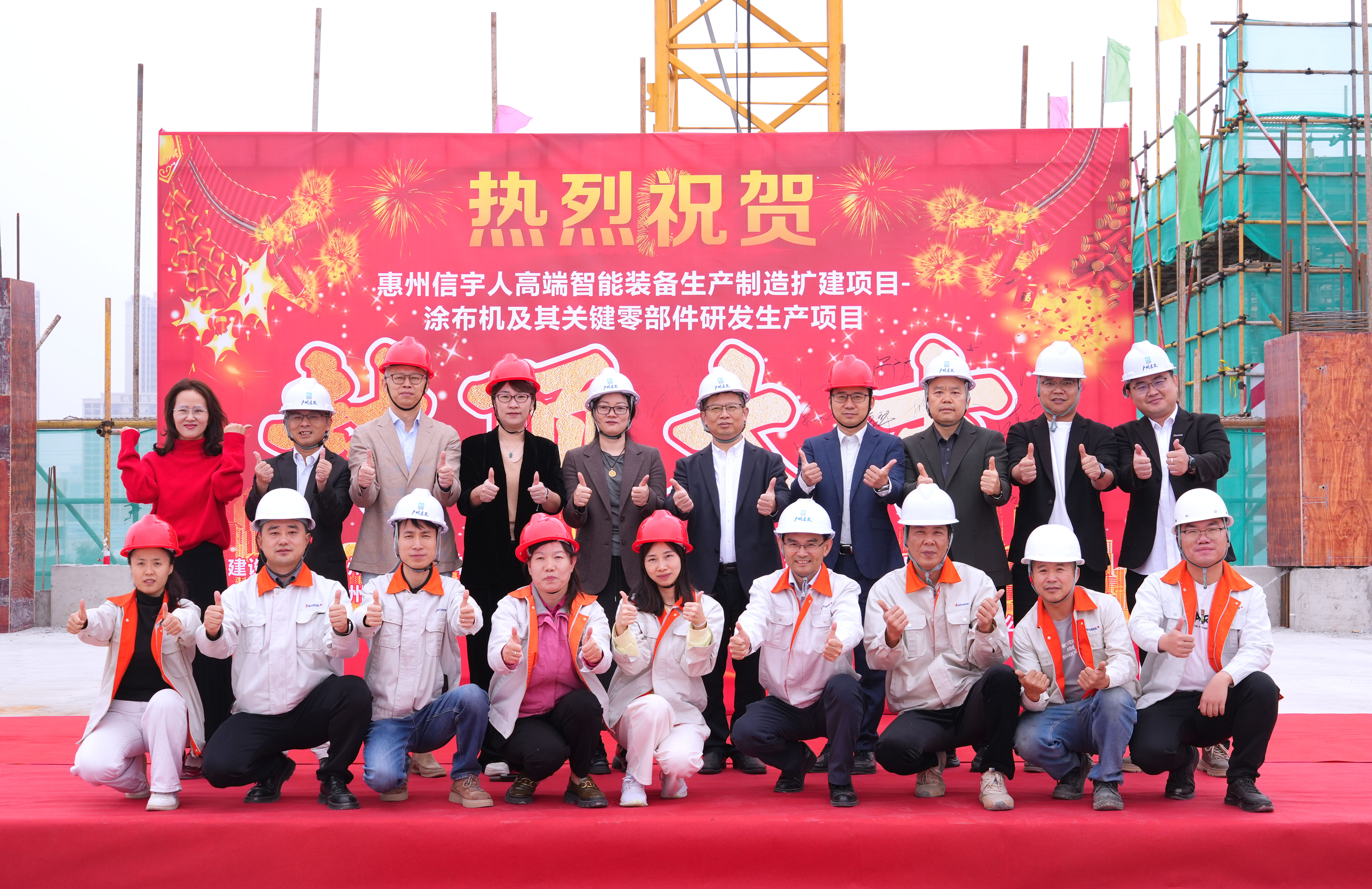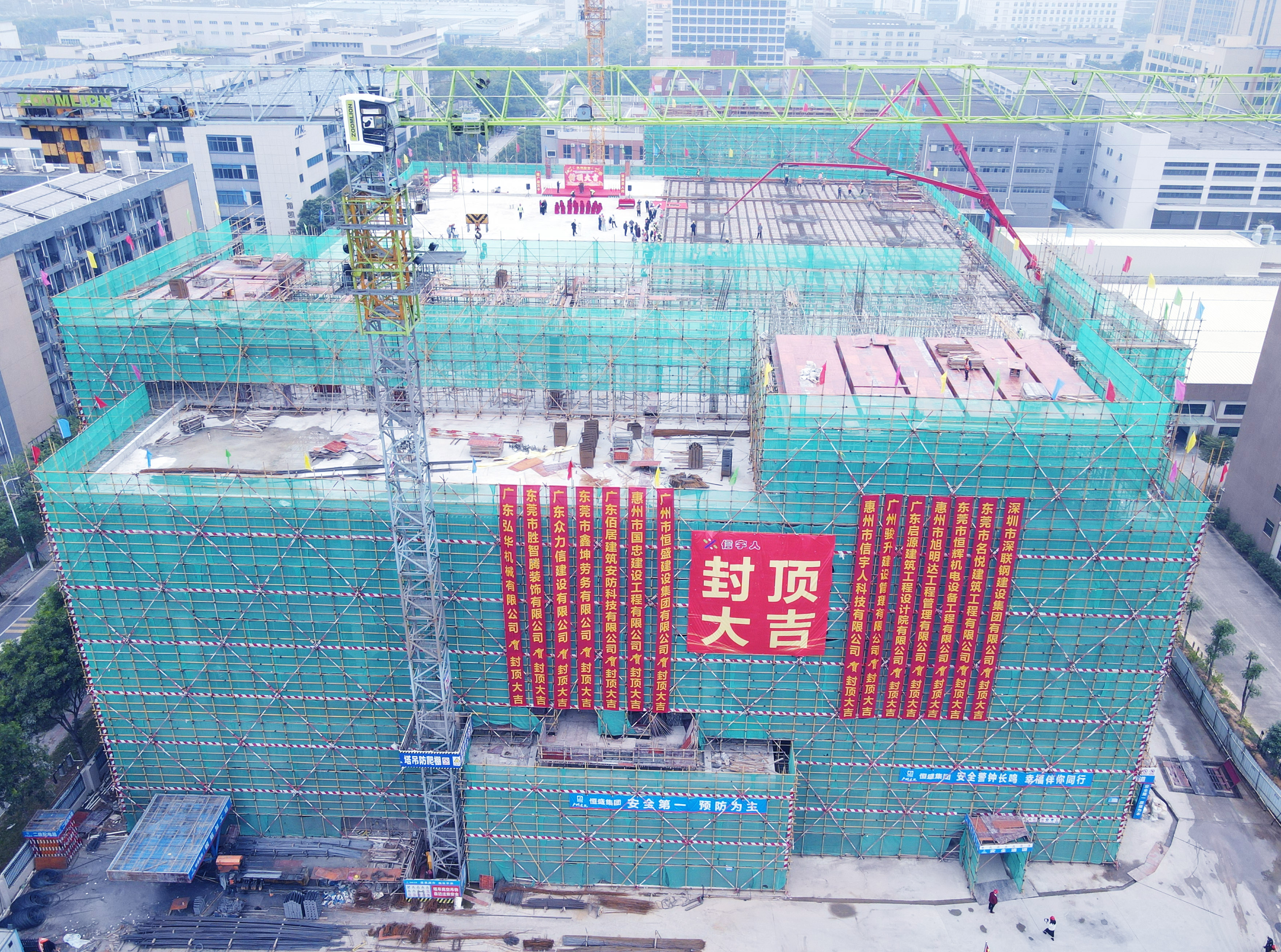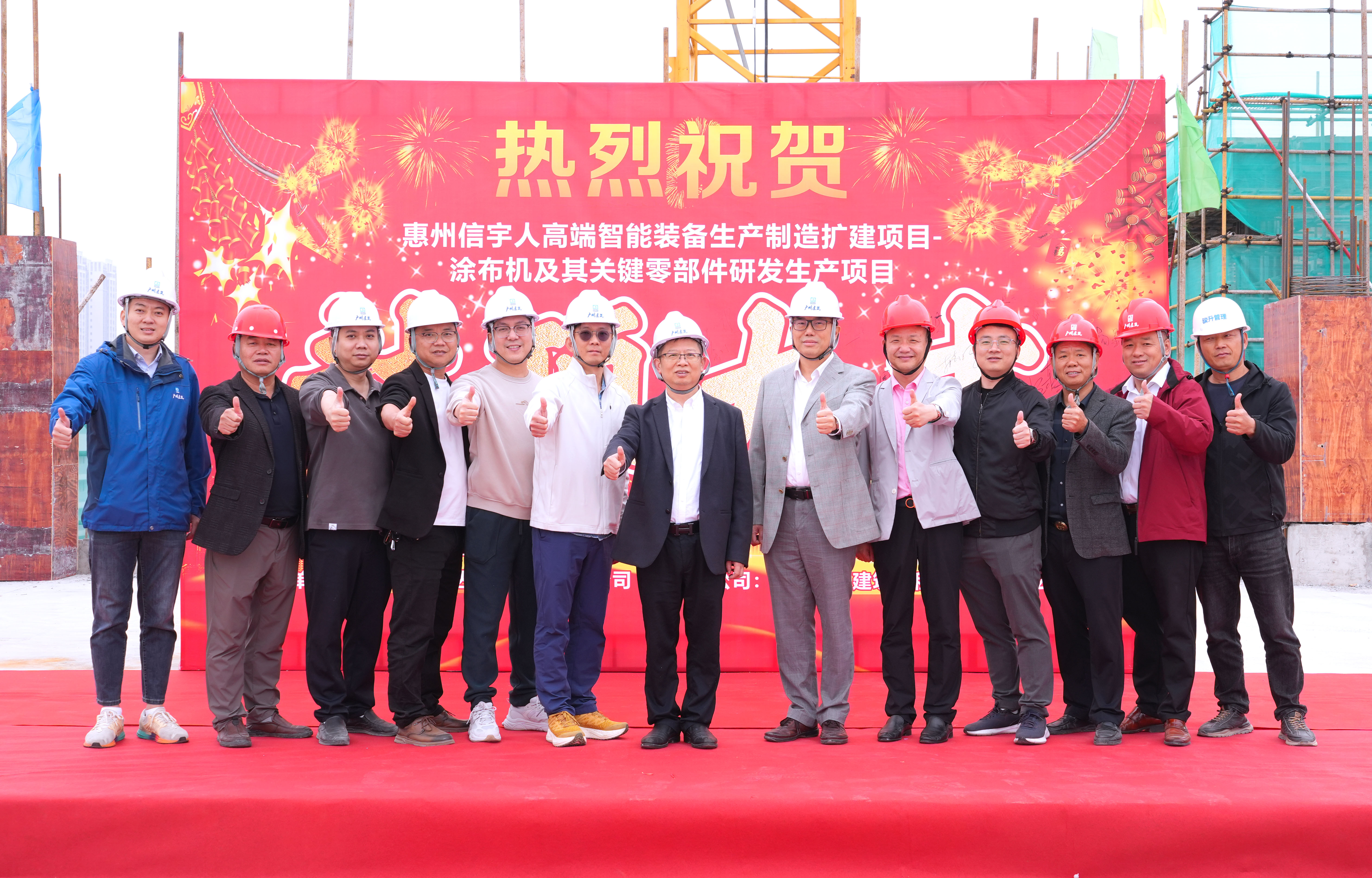 伴随着喜庆的现场氛围,在政府单位代表—惠州市仲恺高新区东江科技园管委会总工会主席、项目建设招商专班负责人胡由在,古天乐太阳集团城董事长杨志明及公司高管、相关管理人员,承建单位—广州恒盛集团总经理曾广庆、副总经理欧建辉等一众人员的共同见证下,古天乐太阳集团城惠州第二生产园区(惠州古天乐太阳集团城高端智能装备生产制造扩建项目—涂布机及其关键零部件研发生产项目)喜封金顶!