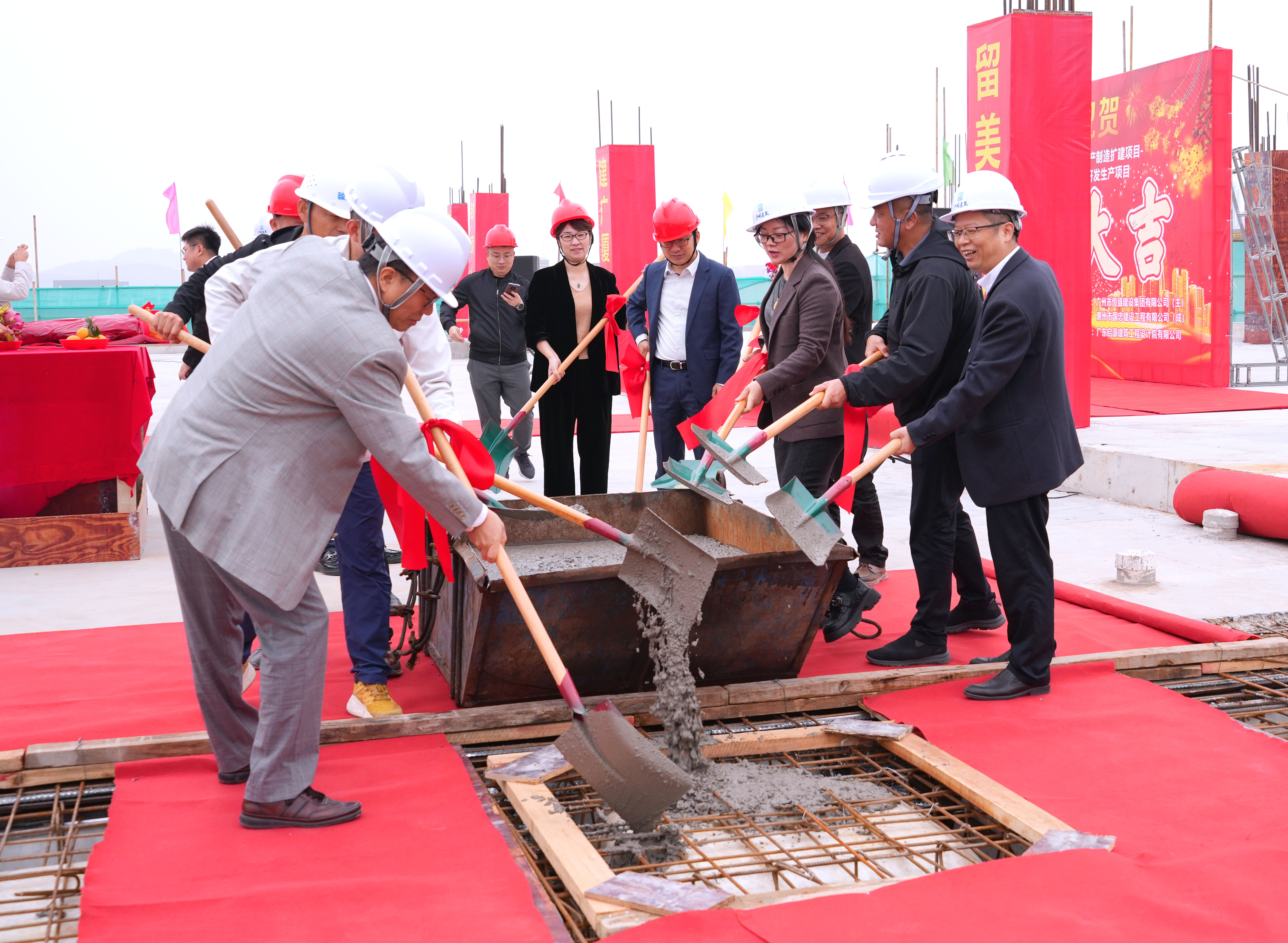 随着各位领导和嘉宾手持铁锹,共同挥锹浇筑混凝土,与此同时,礼炮齐鸣,标志着古天乐太阳集团城惠州第二生产园区顺利封顶,为后续工程推进奠定了坚实基础。